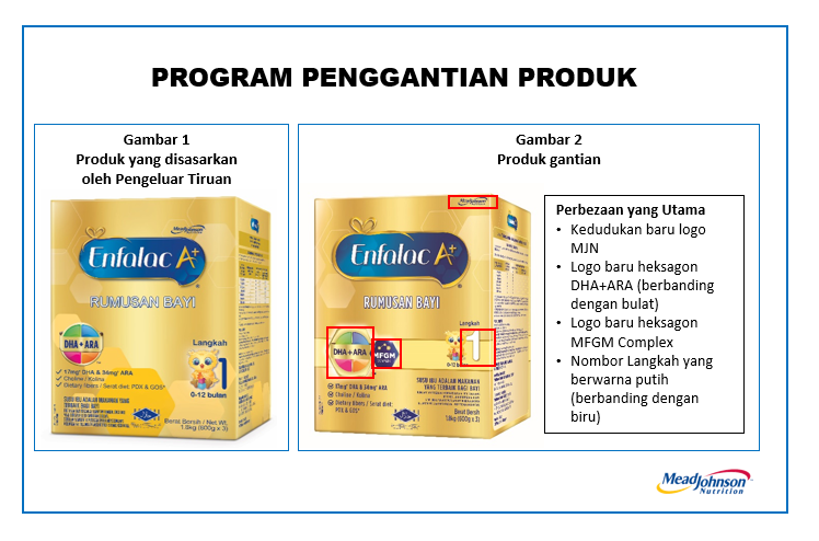 Dengan meletakkan keselamatan dan keyakinan pengguna sebagai pertimbangan utama kami, Mead Johnson Nutrition (MJN) menasihatkan pengguna dan peruncit di seluruh negara agar memulangkan Rumusan Bayi Enfalac A+ Langkah 1 dalam kotak 1.8kg (tiga pek dalam setiap kotak) seperti yang ditunjukkan dalam Gambar 1 dibawah dalam pengumuman ini untuk penggantian segera bermula 15 Disember 2017.
